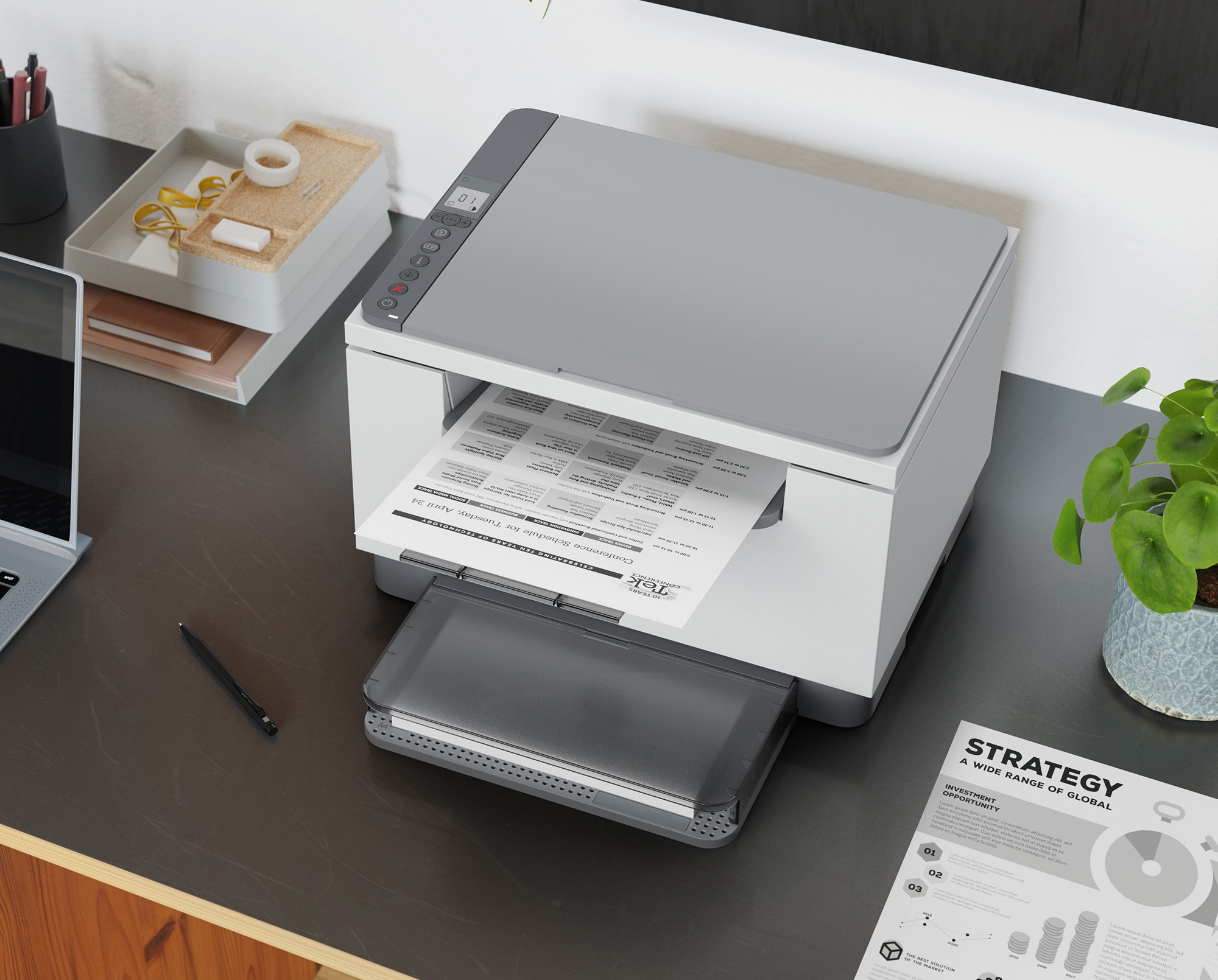 Un echipament MFP de înaltă productivitate, care asigură cea mai rapidă imprimare față-verso din această clasă[5, 6] și aplicația HP Smart, cu care faci economie de timp. [2, 3, 4]